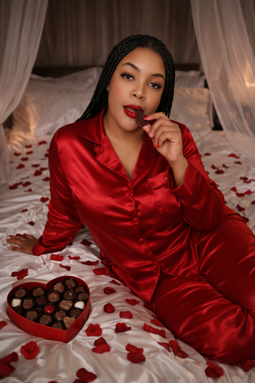 Create a curvy woman in red silk Valentine's red satin 2 piece pajamas on a bed covered in rose petals, the bed sheets are white satin with sheer white curtains on the canopy bed, a heart-shaped box of chocolates on the bed in front of her, she has a piece of heart shape chocolate up to her mouth, moody lighting, soft shadows, photorealistic, 4k makeup is soft glam with red lipstick . Keep the face the same as the attached photo🎨 Create a curvy woman in red silk Valentine's red satin 2 piece pajamas on a bed covered in rose petals, the bed sheets are white satin with sheer white curtains on the canopy bed, a heart-shaped box of chocolates on the bed in front of her, she has a piece of heart shape chocolate up to her mouth, moody lighting, soft shadows, photorealistic, 4k makeup is soft glam with red lipstick . Keep the face the same as the attached photo6