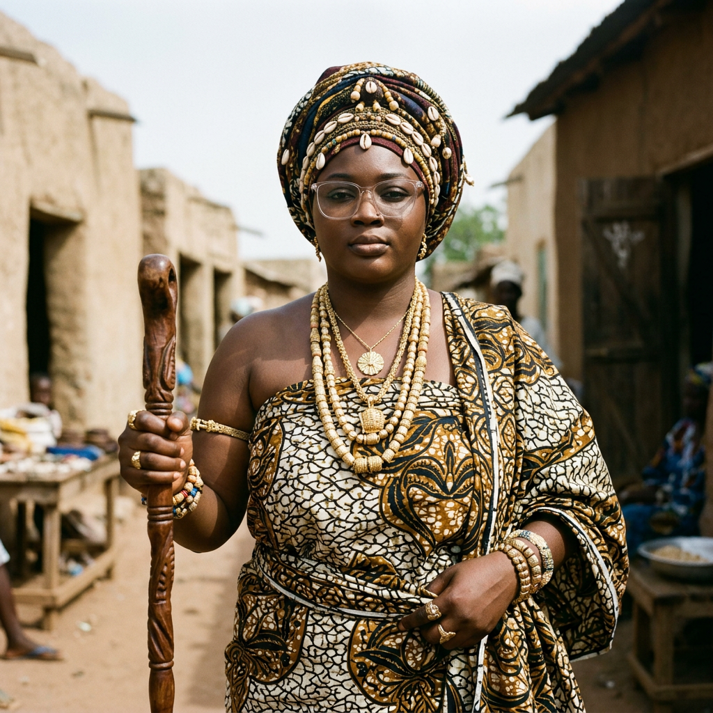 Signes de dignité, de beauté et de puissance.Debout et fière,je représente une femme courageuse de l'époque coloniale. Avec un bâton à la main, je symbolise la force et la détermination. Je porte des bijoux aux poignets autour du cou et sur la tête, Signes de dignité, de beauté et de puissance.5