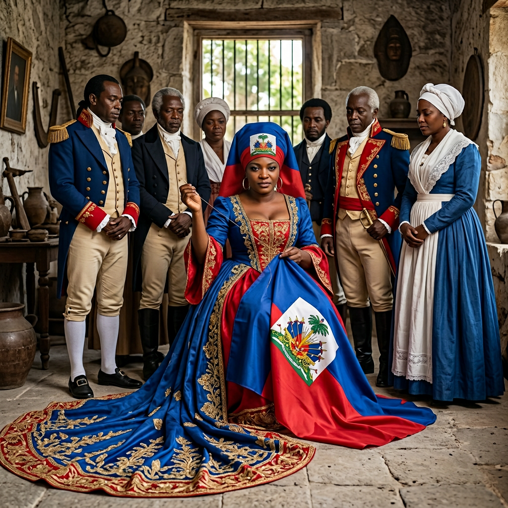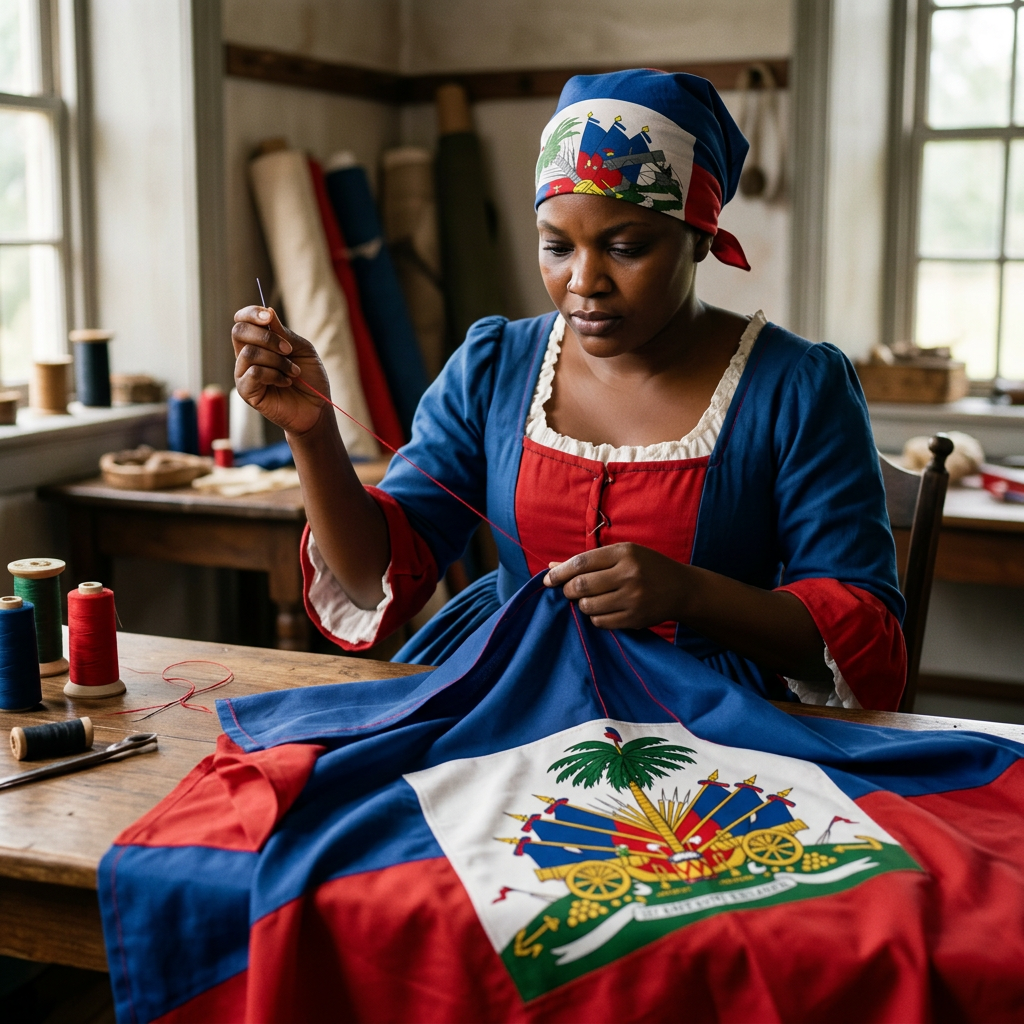Je veux une photo du comment où Catherine Flon est en train de coudre le drapeau aiguille et du fil je porte une Robe bleue et rouge. Le drapeau est attaché sur ma tête l'emblème apparaît au milieu. Je représente présente la fierté, la force et l'histoire d,aHitiJe veux une photo du comment où Catherine Flon est en train de coudre le drapeau aiguille et du fil je porte une Robe bleue et rouge. Le drapeau est attaché sur ma tête l'emblème apparaît au milieu. Je représente présente la fierté, la force et l'histoire d,aHiti5