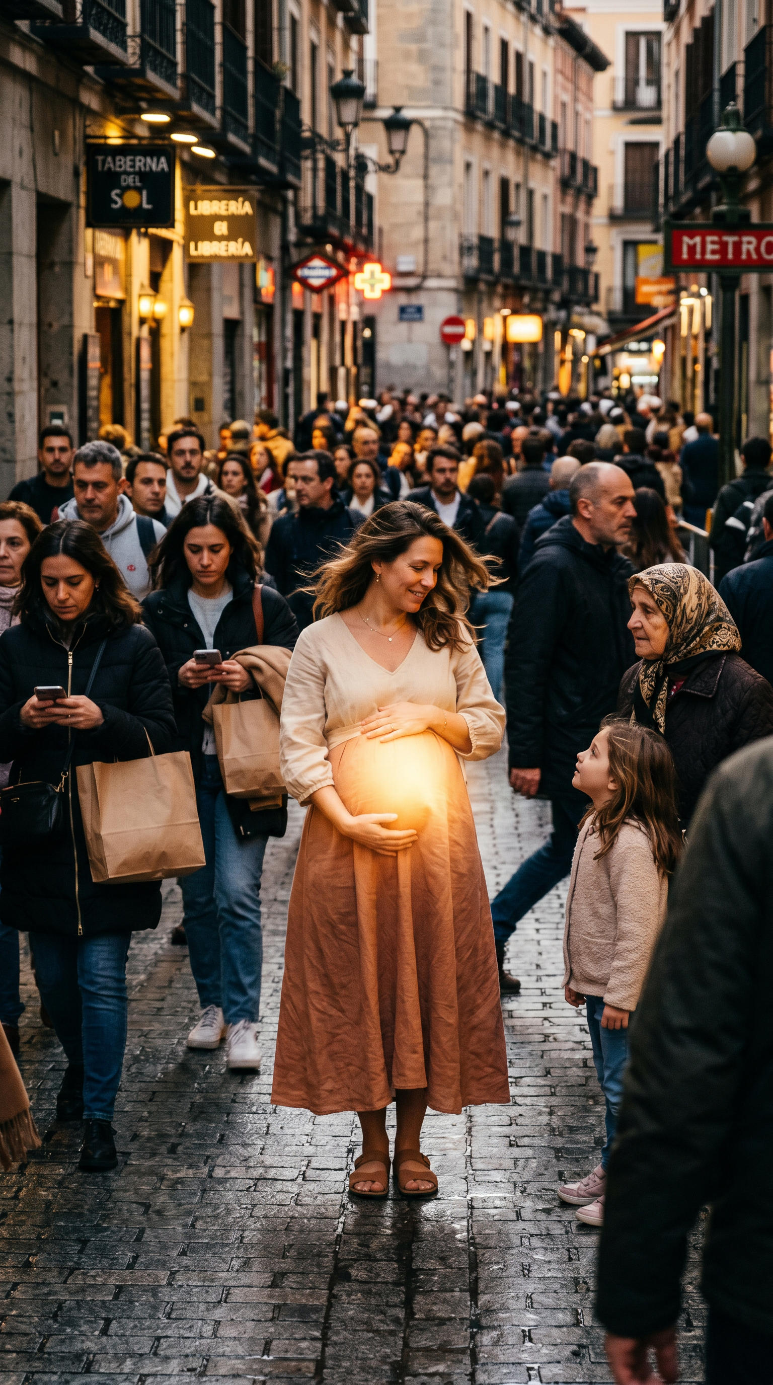 Una mujer embarazada en el centro de una multitud, destacando con una luz cálida que simboliza vida y esperanza. Su vientre brilla suavemente, mientras las personas a su alrededor representan el mundo cotidiano: algunos distraídos, otros admirando en silencio. La escena transmite fuerza, creación y el milagro de la vida en medio del caos urbano. Estilo realista, iluminación cinematográfica, alta calidad, emociones profundas, enfoque en el contraste entre la multitud y la madre. @future Mother challenge @futuremotherUna mujer embarazada en el centro de una multitud, destacando con una luz cálida que simboliza vida y esperanza. Su vientre brilla suavemente, mientras las personas a su alrededor representan el mundo cotidiano: algunos distraídos, otros admirando en silencio. La escena transmite fuerza, creación y el milagro de la vida en medio del caos urbano. Estilo realista, iluminación cinematográfica, alta calidad, emociones profundas, enfoque en el contraste entre la multitud y la madre. @future Mother challenge @futuremother3