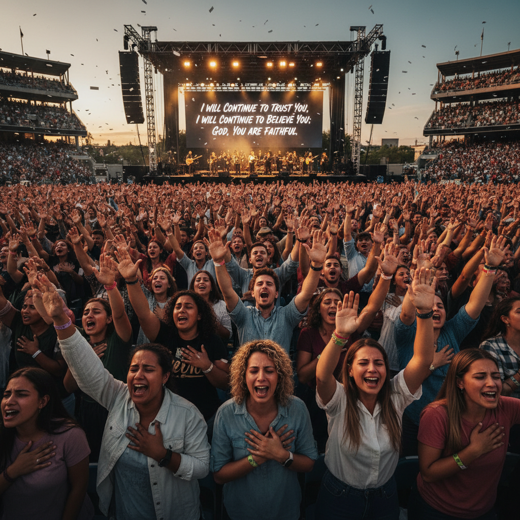 "A crowd in tears, hands over their heads, crying out with arms lifted high—one hand reaching up, the other pressed against their heart—singing: 'I will continue to trust You, I will continue to believe in You; God, You are faithful.'""A crowd in tears, hands over their heads, crying out with arms lifted high—one hand reaching up, the other pressed against their heart—singing: 'I will continue to trust You, I will continue to believe in You; God, You are faithful.'"9