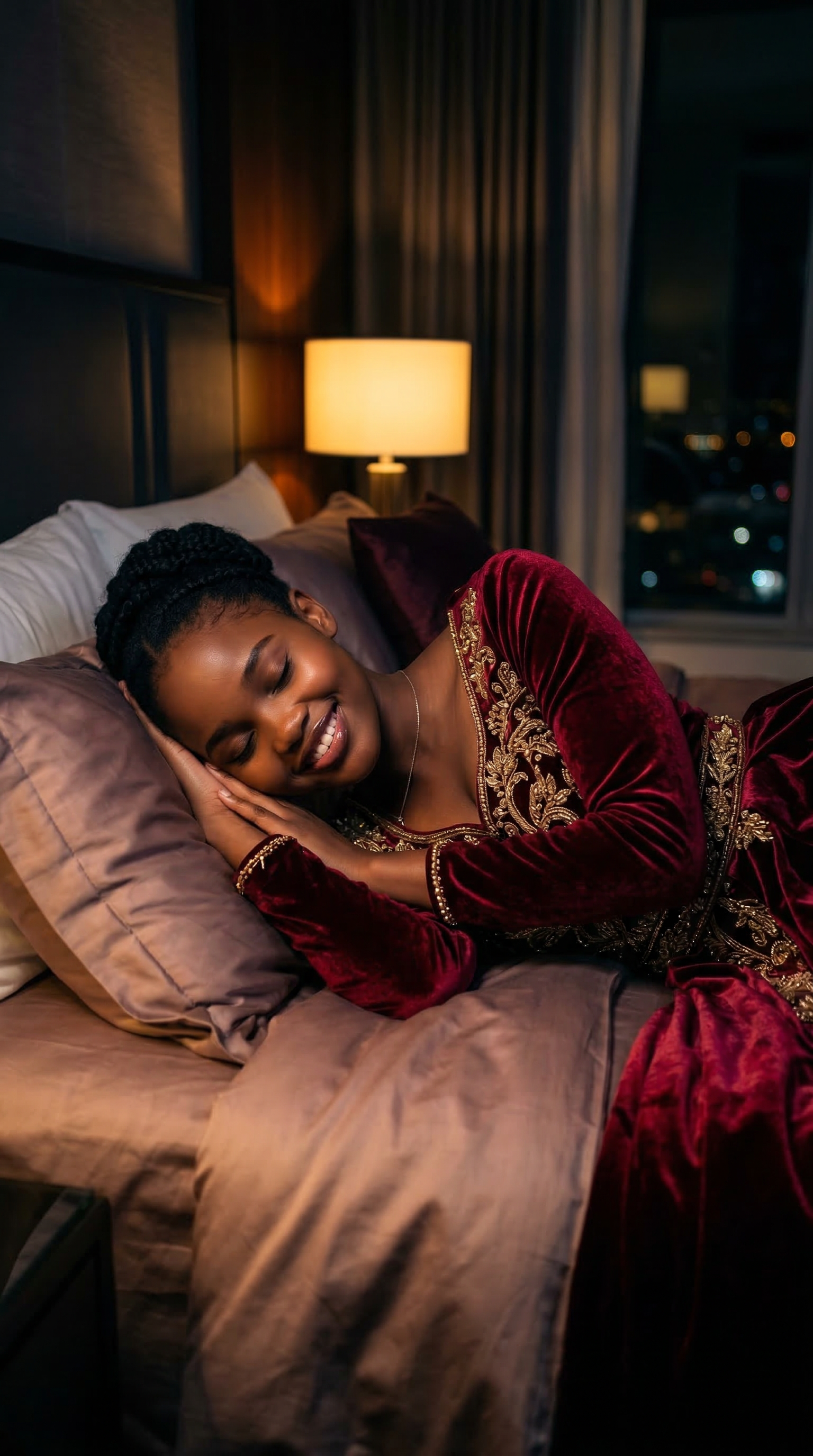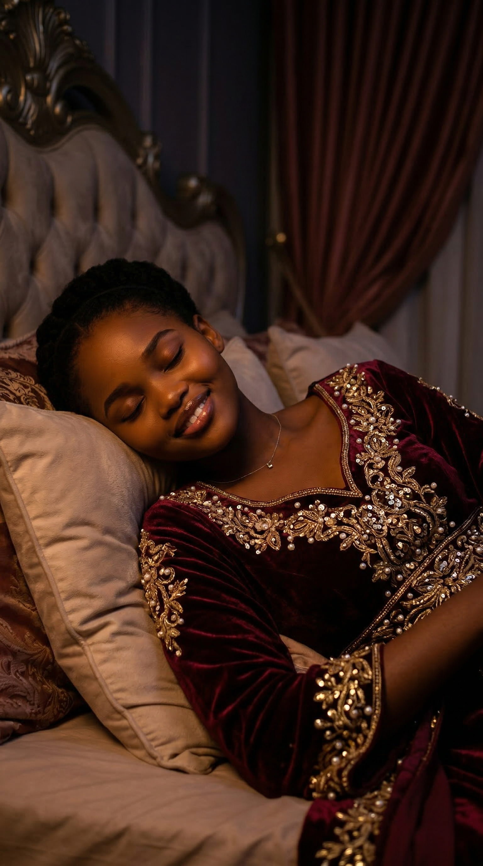 1. A curvy, voluptuous woman sleeping peacefully in a luxurious high-fashion couture gown, lying in a stylish indoor bedroom at night. The room is dimly lit with cinematic, moody lighting casting soft shadows that highlight her joyful, smiling expression even in slumber. Her consistent facial features and signature accessories are clearly visible, enhancing her elegant presence. The atmosphere is intimate and serene, with rich textures and deep colors creating a sophisticated nighttime ambiance.1. A curvy, voluptuous woman sleeping peacefully in a luxurious high-fashion couture gown, lying in a stylish indoor bedroom at night. The room is dimly lit with cinematic, moody lighting casting soft shadows that highlight her joyful, smiling expression even in slumber. Her consistent facial features and signature accessories are clearly visible, enhancing her elegant presence. The atmosphere is intimate and serene, with rich textures and deep colors creating a sophisticated nighttime ambiance.9