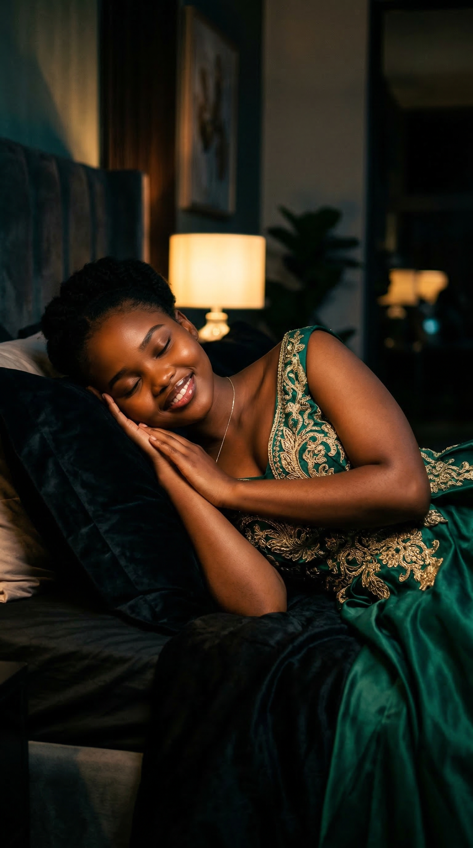 2. A full-figured woman dressed in an exquisite designer couture dress, asleep alone in a modern indoor bedroom during nighttime. Cinematic moody lighting bathes the scene in deep shadows and warm highlights, emphasizing the softness of her joyful, smiling face and recognizable accessories. The composition captures her curvy silhouette resting comfortably on high-end bedding, evoking a sense of peaceful contentment and luxury in a dark, atmospheric room.2. A full-figured woman dressed in an exquisite designer couture dress, asleep alone in a modern indoor bedroom during nighttime. Cinematic moody lighting bathes the scene in deep shadows and warm highlights, emphasizing the softness of her joyful, smiling face and recognizable accessories. The composition captures her curvy silhouette resting comfortably on high-end bedding, evoking a sense of peaceful contentment and luxury in a dark, atmospheric room.9