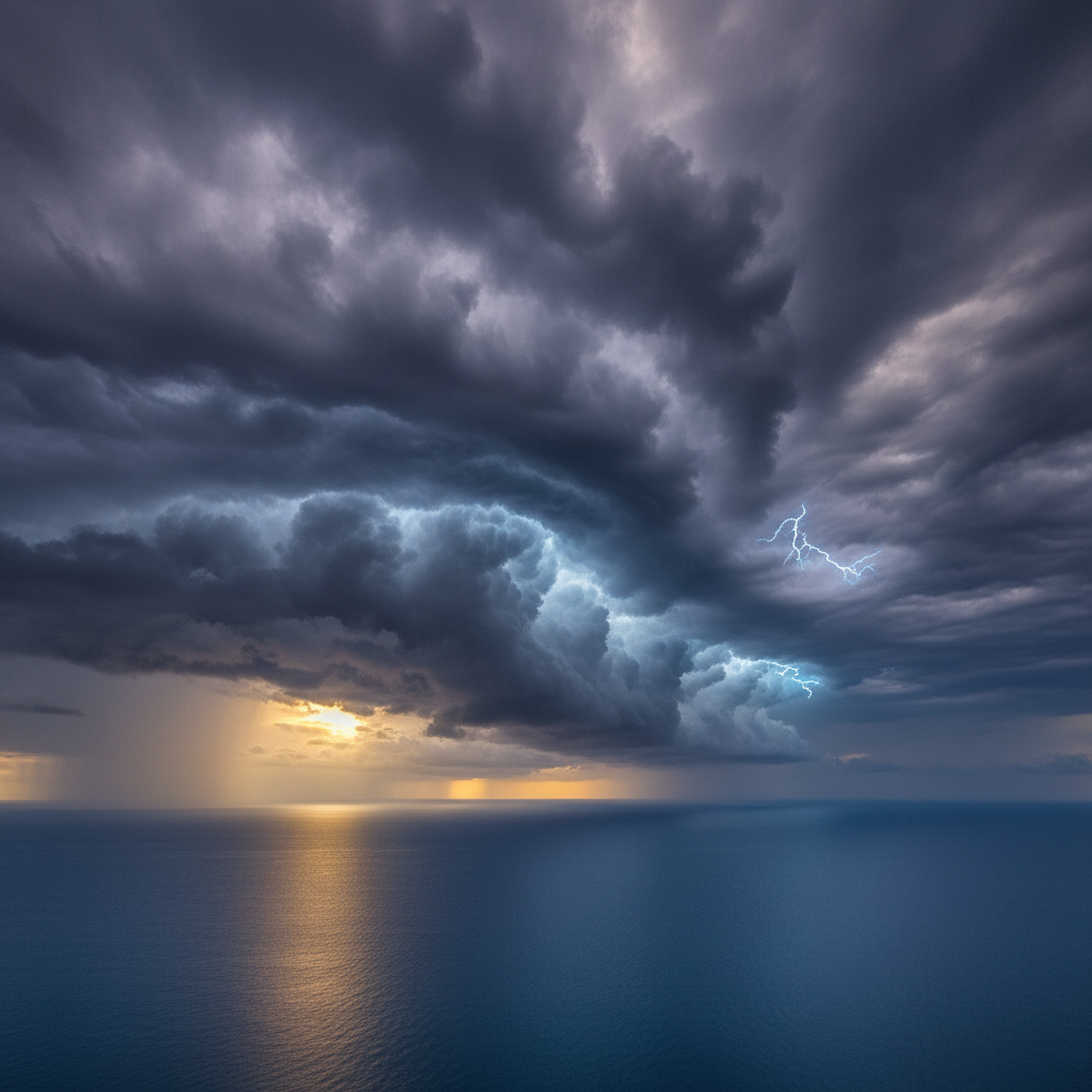 A calm ocean under dramatic storm clouds, cinematic contrastA calm ocean under dramatic storm clouds, cinematic contrast