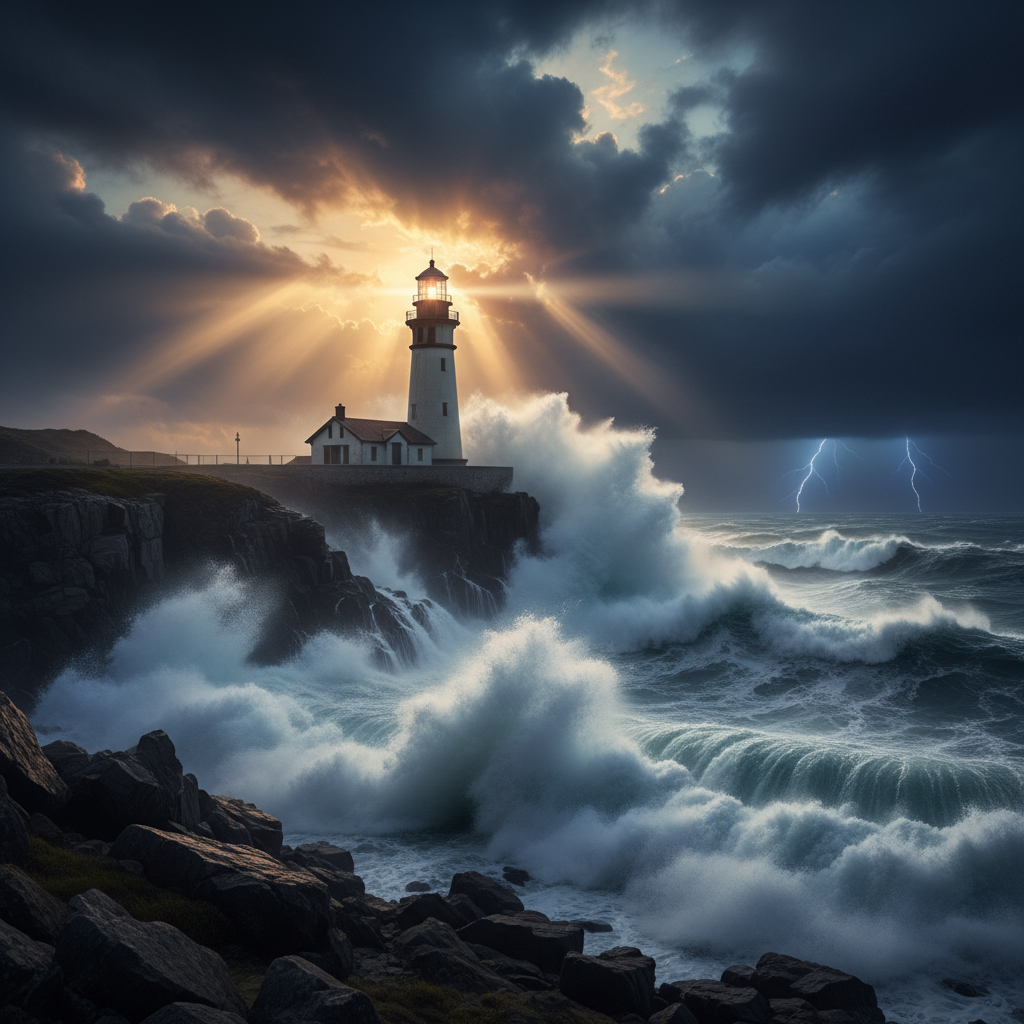 A lighthouse facing massive waves, epic cinematic lightingA lighthouse facing massive waves, epic cinematic lighting