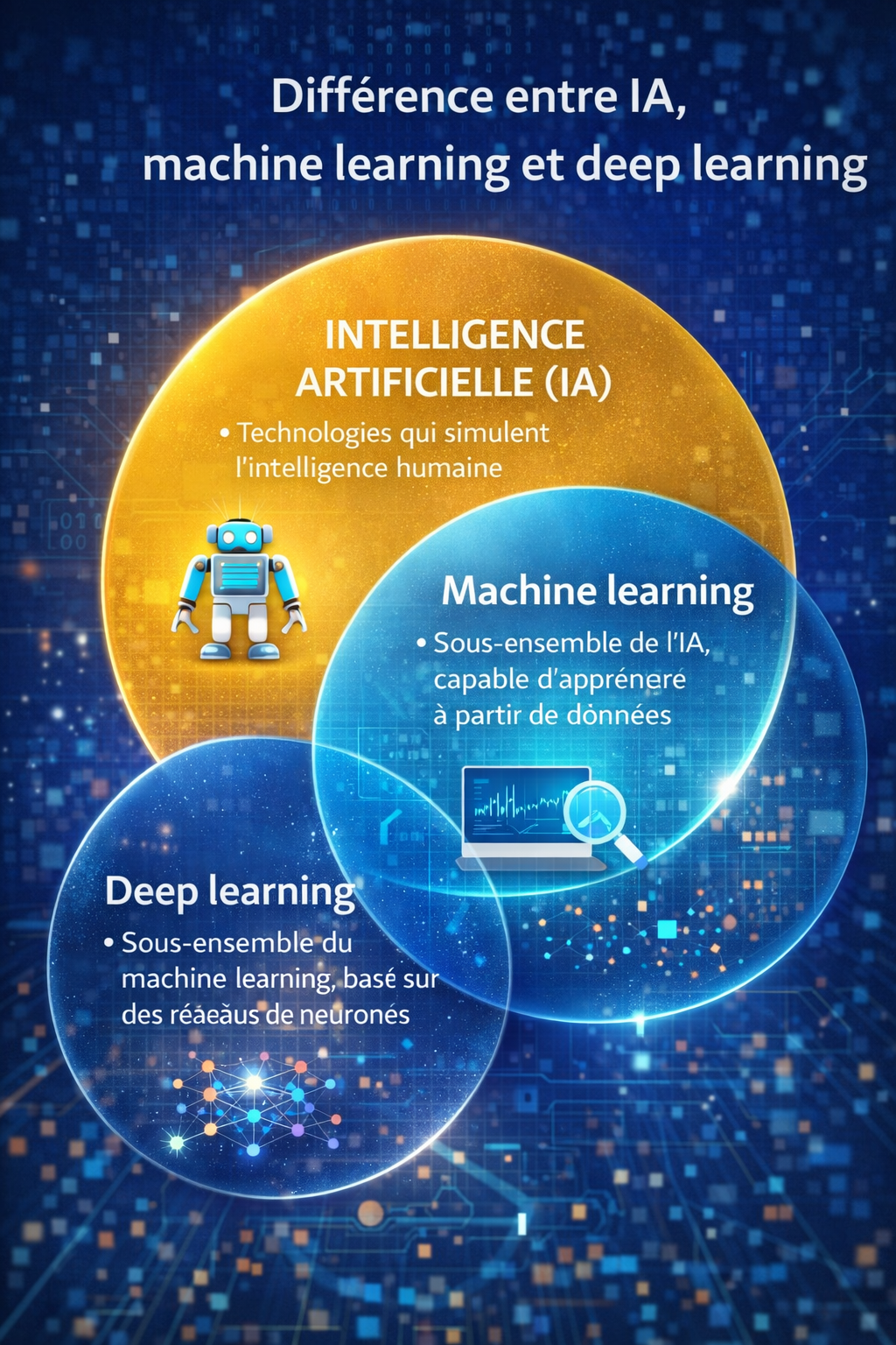 Cette hiérarchie conceptuelle permet de mieux appréhender les technologies actuelles et leur potentiel dans la transformation numérique de nombreux secteurs : santé, finance, industrie, communication, et bien d’autres.