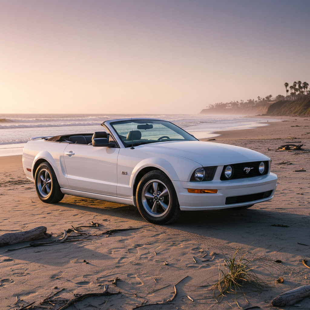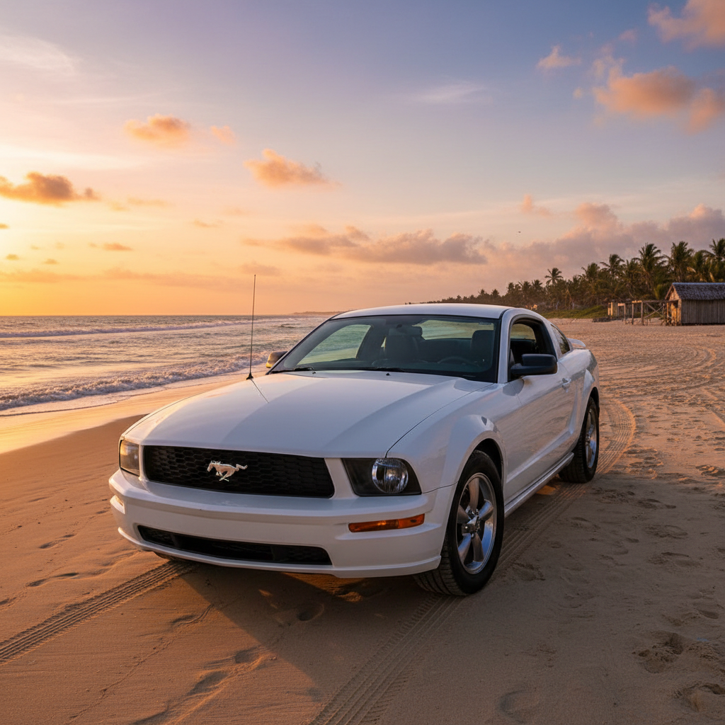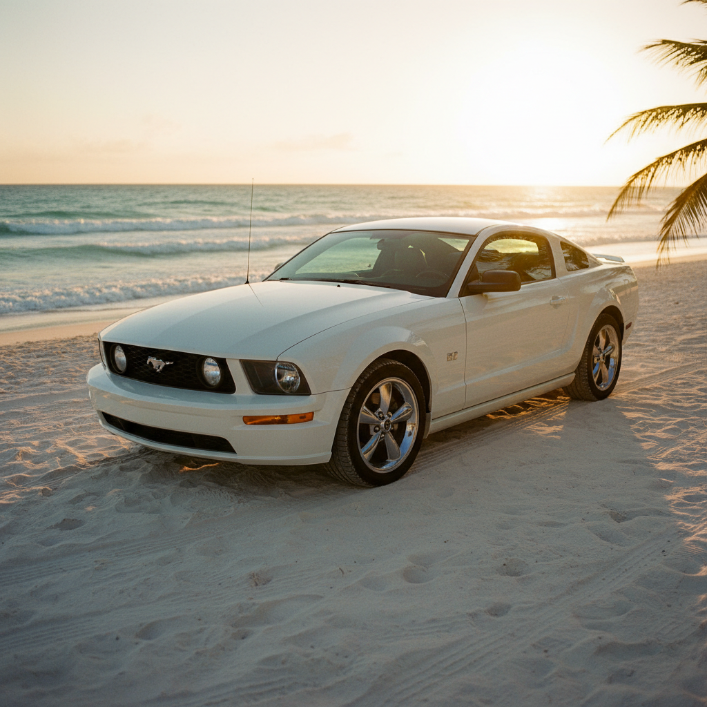 A pristine white 2005 Ford Mustang GT parked on a white sand beach at golden hour. The car is angled to show its side profile and the iconic front grille. Crystal clear turquoise ocean waves in the background, warm sunset glow reflecting on the car's polished white paint and chrome rims. Realistic textures, palm tree shadows subtly hitting the sand, high resolution, cinematic photography, 8k, shot on 35mm lens.A pristine white 2005 Ford Mustang GT parked on a white sand beach at golden hour. The car is angled to show its side profile and the iconic front grille. Crystal clear turquoise ocean waves in the background, warm sunset glow reflecting on the car's polished white paint and chrome rims. Realistic textures, palm tree shadows subtly hitting the sand, high resolution, cinematic photography, 8k, shot on 35mm lens.8