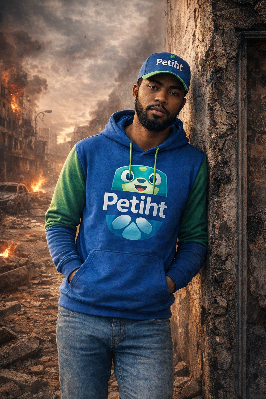 redesign the wall behind the man add appocalypse scene effect