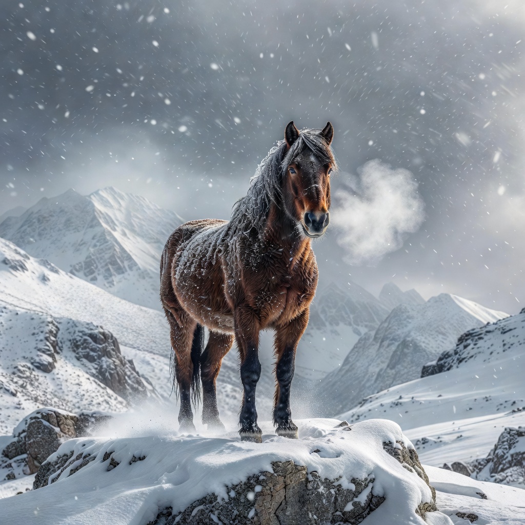 • Horse on a montain during a snow