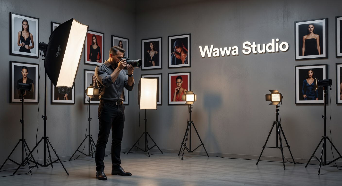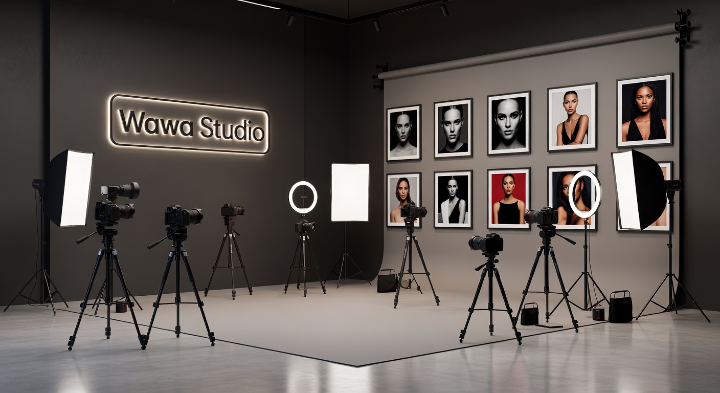 • Create a realistic professional photography studio interior. The studio should include cameras, tripods, softbox lights, ring lights, flash equipment, and a modern photography background setup. Add several photo frames on the wall showing model portraits like a real photography gallery. Make the studio look modern, clean, and professional. Add the name "Wawa Studio" on the wall in a stylish glowing logo frame. Cinematic lighting, very detailed, high quality, 4K.