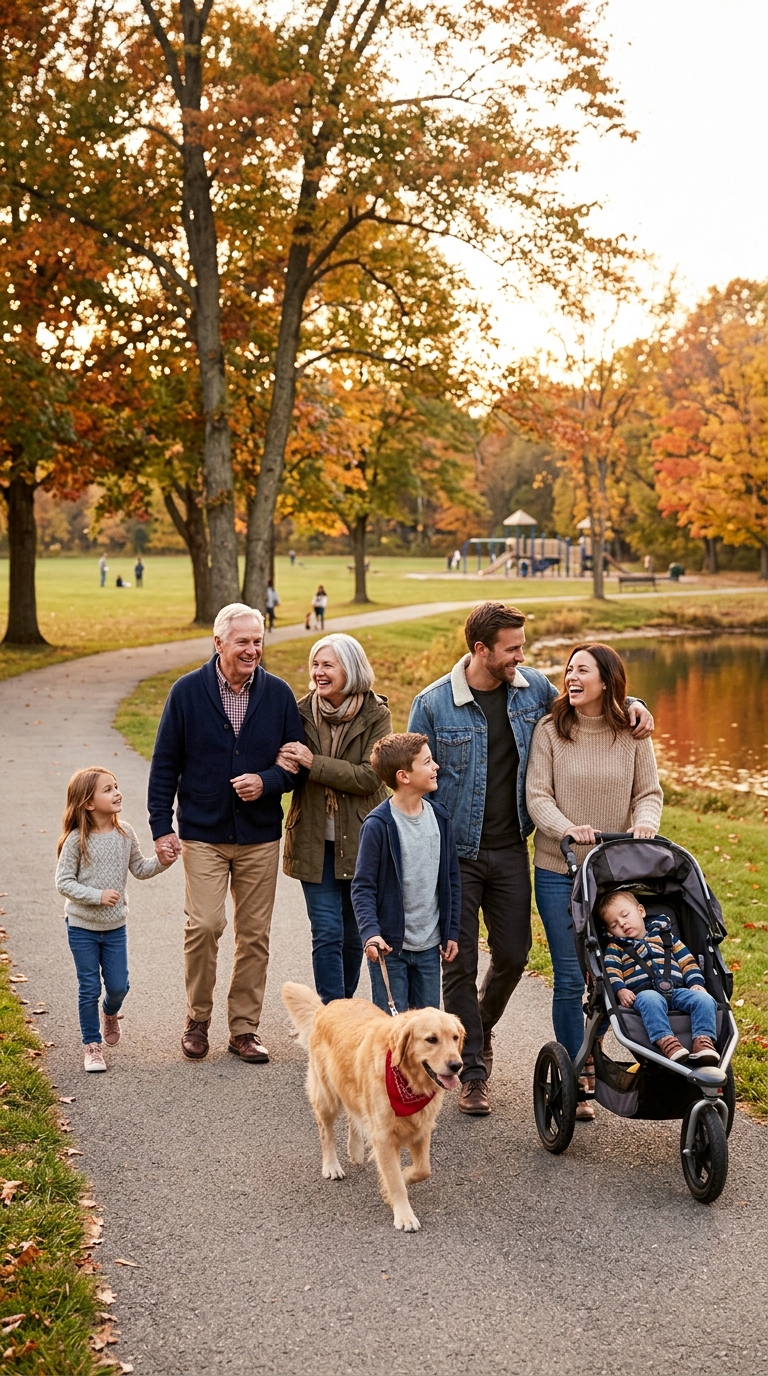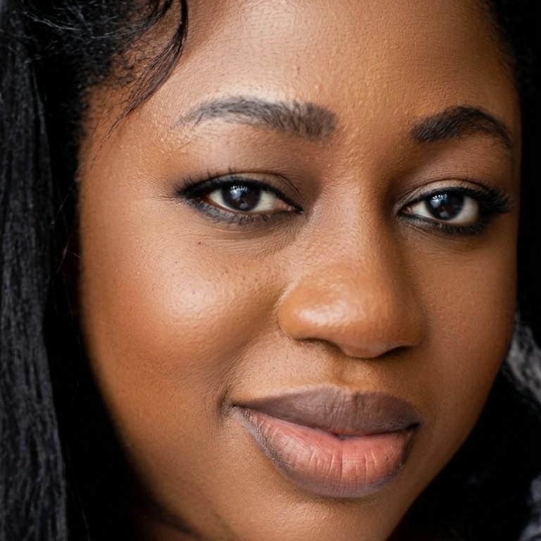 In a cinematic autumn studio setting, a brown-skinned plus-size woman dances tenderly with her partner, exuding romance and elegance. She dons a luxurious traditional ensemble in bold gold and radiant red tones, inspired by high-end designers like Dolce & Gabbana or Gucci, with an off-shoulder neckline that beautifully reveals her skin. Her iconic black and white geometric foulard is perfectly styled, paired with a clean, pulled-back ponytail revealing her peaceful, smiling face. Her makeup is minimal yet highlights her captivating eyes, maintaining recognizable features and consistent accessories. She strikes a spontaneous pose with her hand gently supporting her chin, adding an authentic and intimate feel. The cinematic autumn lighting bathes the scene in warm, golden amber tones, castintic shadows that deepen the romantic ambiance.