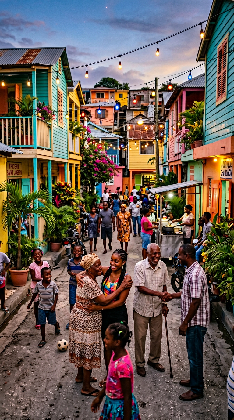 A vibrant evening street scene in Haiti, with people of various ages greeting each other warmly, colorful Creole-style houses, festive lights hanging above, lively atmosphere, warm smiles, tropical plants, and a soft twilight sky—capturing a sense of community and friendliness.