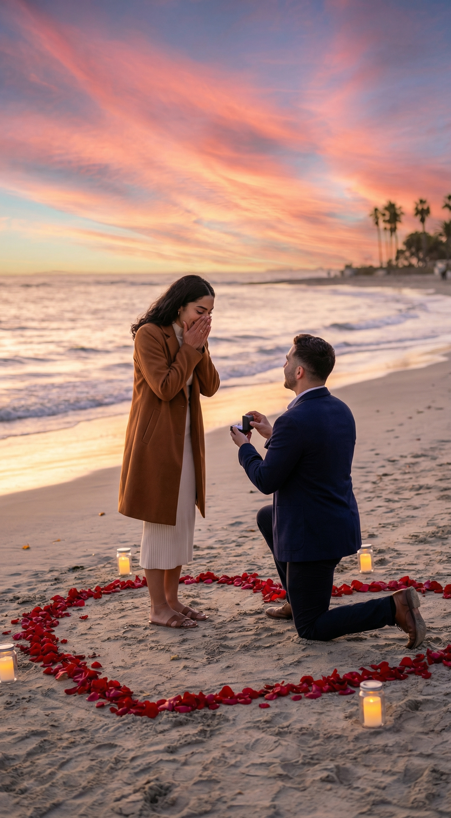 Create a cinematic Valentine’s Day scene of a romantic marriage proposal at sunset on a quiet beach. The sky is glowing in shades of pink, orange, and lavender. A couple stands near the shoreline, the man kneeling while holding a small velvet ring box. The woman covers her mouth in joyful surprise. Soft waves reflect golden light. Rose petals are scattered in the sand forming a heart shape. Warm ambient lighting, dramatic sky, ultra-detailed textures, 8K resolution, shallow depth of field, soft bokeh in the background, natural skin tones, emotional facial expressions, cinematic color grading, romantic atmosphere. #valentinechallenge🎨 Create a cinematic Valentine’s Day scene of a romantic marriage proposal at sunset on a quiet beach. The sky is glowing in shades of pink, orange, and lavender. A couple stands near the shoreline, the man kneeling while holding a small velvet ring box. The woman covers her mouth in joyful surprise. Soft waves reflect golden light. Rose petals are scattered in the sand forming a heart shape. Warm ambient lighting, dramatic sky, ultra-detailed textures, 8K resolution, shallow depth of field, soft bokeh in the background, natural skin tones, emotional facial expressions, cinematic color grading, romantic atmosphere. #valentinechallenge17