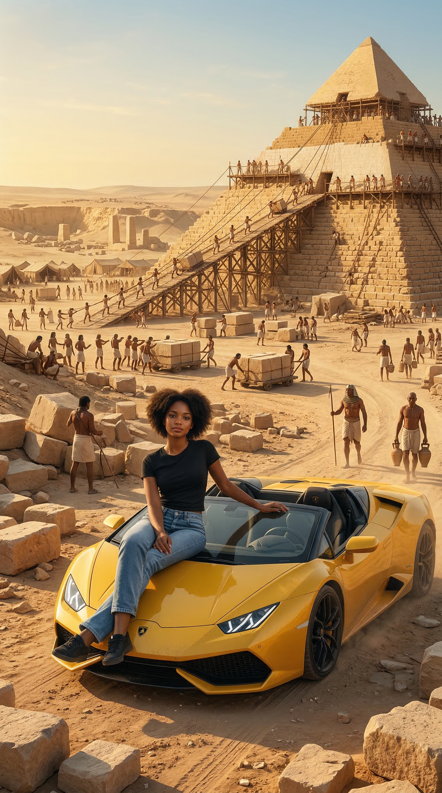 A girl sitting on a Lamborghini in ancient Egypt, watching Egyptian workers building a pyramid in the background, cinematic, realistic, detailed, historical environment, desert, warm sunlight, high qualityA girl sitting on a Lamborghini in ancient Egypt, watching Egyptian workers building a pyramid in the background, cinematic, realistic, detailed, historical environment, desert, warm sunlight, high quality5