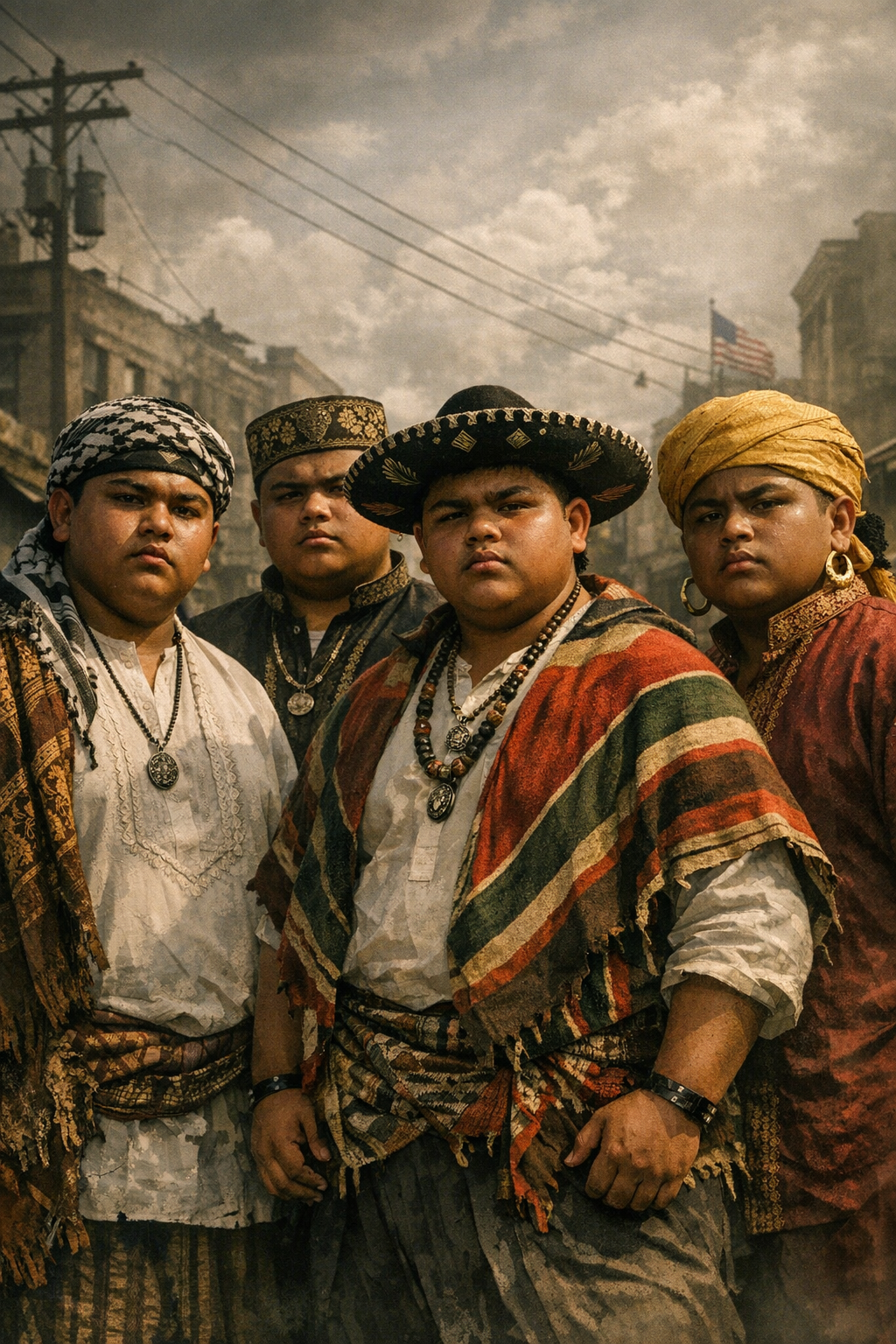 A cinematic portrait of a group of teenage male friends with medium brown caramel skin and curvy, full-figured bodies, standing and posing confidently in traditional cultural ethnic clothing. Their expressions are serious, intense, focused, and determined as they face the camera with recognizable, consistent facial features and accessories that reflect their heritage. The scene is set in an urban cityscape on a sunny day with a clear sky, yet the lighting is dramatic and moody, reminiscent of a 1945 wartime atmosphere. The composition captures a powerful moment of unity and resilience, blending vintage war-era tension with modern cultural pride.A cinematic portrait of a group of teenage male friends with medium brown caramel skin and curvy, full-figured bodies, standing and posing confidently in traditional cultural ethnic clothing. Their expressions are serious, intense, focused, and determined as they face the camera with recognizable, consistent facial features and accessories that reflect their heritage. The scene is set in an urban cityscape on a sunny day with a clear sky, yet the lighting is dramatic and moody, reminiscent of a 1945 wartime atmosphere. The composition captures a powerful moment of unity and resilience, blending vintage war-era tension with modern cultural pride.6