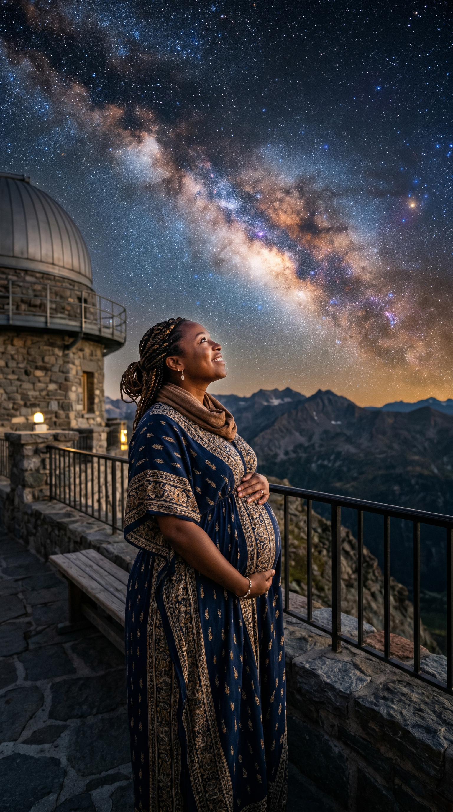 Une femme noire enceinte contemplant l’univers, les mains sur son ventre,Et excitée de voir son précieux cadeau.Une femme noire enceinte contemplant l’univers, les mains sur son ventre,Et excitée de voir son précieux cadeau.1