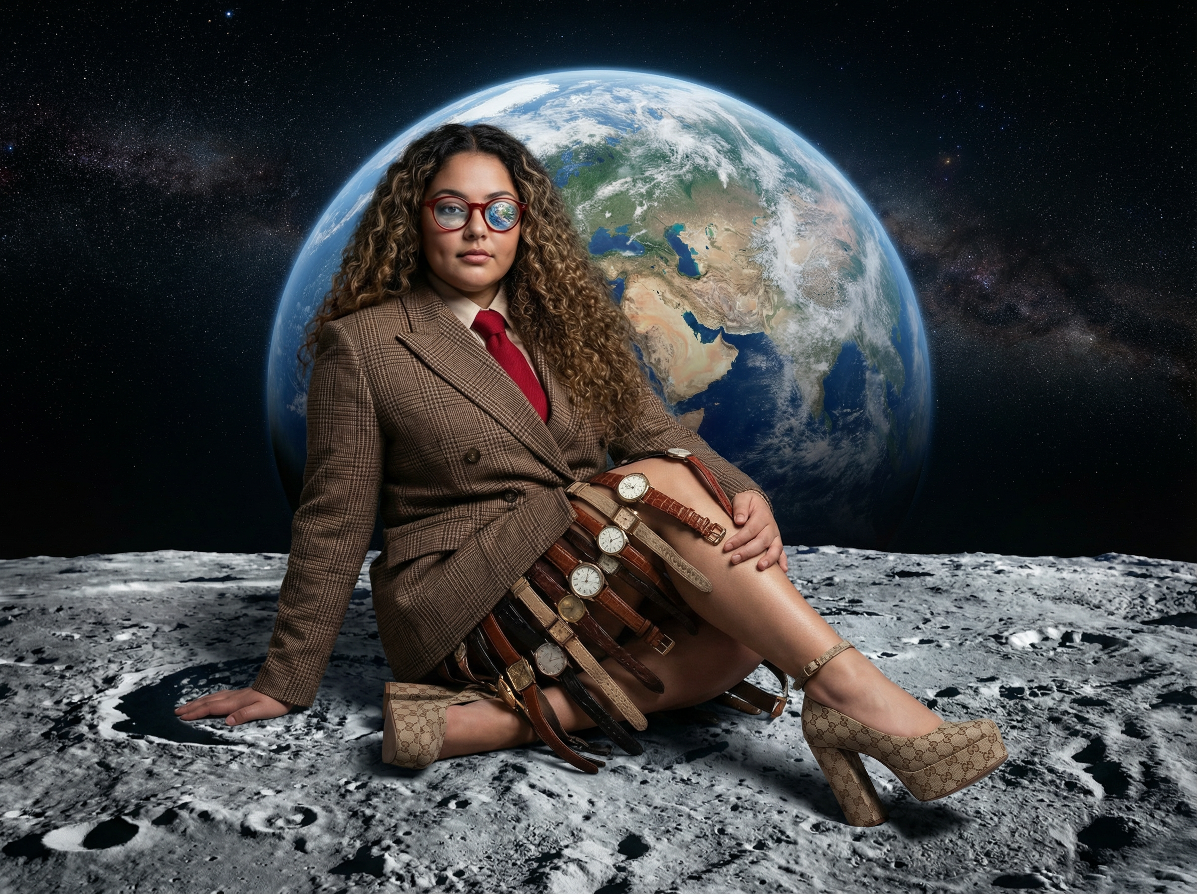 She sits with one knee raised, posture upright and centered. Cool silver moonlight rim lighting. Natural cinematic key light on her face with realistic shadow depth. All elements sharp and detailed — moon, Earth, Milky Way, subject. Museum-level fine art realism. Medium-format clarity. No fantasy exaggeration.🎨 Identity locked to the reference image. Do not alter facial proportions. Ultra-cinematic 8K hyper-realistic portrait of the woman from the reference image seated on the surface of a massive full moon positioned at the bottom of the frame. The moon is extremely close to the viewer with hyper-detailed craters, textured lunar dust, natural rock formations, and deep realistic shadow pockets. Scientifically grounded realism. No fantasy glow. Behind her, the Earth is clearly visible in sharp, detailed focus — vivid blue oceans, swirling cloud systems, visible continents, natural atmospheric glow, accurate planetary scale. Not blurred. A faint Milky Way band stretches softly behind the Earth, subtle and astrophotography-realistic. Deep pitch-black cosmic sky with restrained star presence. High contrast, bold composition. Her face must match the reference image exactly — identical bone structure, almond-shaped eyes, nose shape, lips, dimples, natural skin texture, visible pores, warm light-brown complexion. No beautification filters. No facial reshaping. Expression: composed, neutral, controlled. Minimal smile. Steady gaze. Calm authority. She wears round red academic glasses with chain detail. A faint, realistic reflection of the Earth appears in the lenses. Long, voluminous, tightly curled natural hair with realistic definition. Structured brown double-breasted plaid blazer, deep red tie, sculptural skirt made of layered vintage watch straps and belts. Watch faces display subtly different times, realistic clock detail. Beige monogram platform heels with wooden heels. She sits with one knee raised, posture upright and centered. Cool silver moonlight rim lighting. Natural cinematic key light on her face with realistic shadow depth. All elements sharp and detailed — moon, Earth, Milky Way, subject. Museum-level fine art realism. Medium-format clarity. No fantasy exaggeration.7