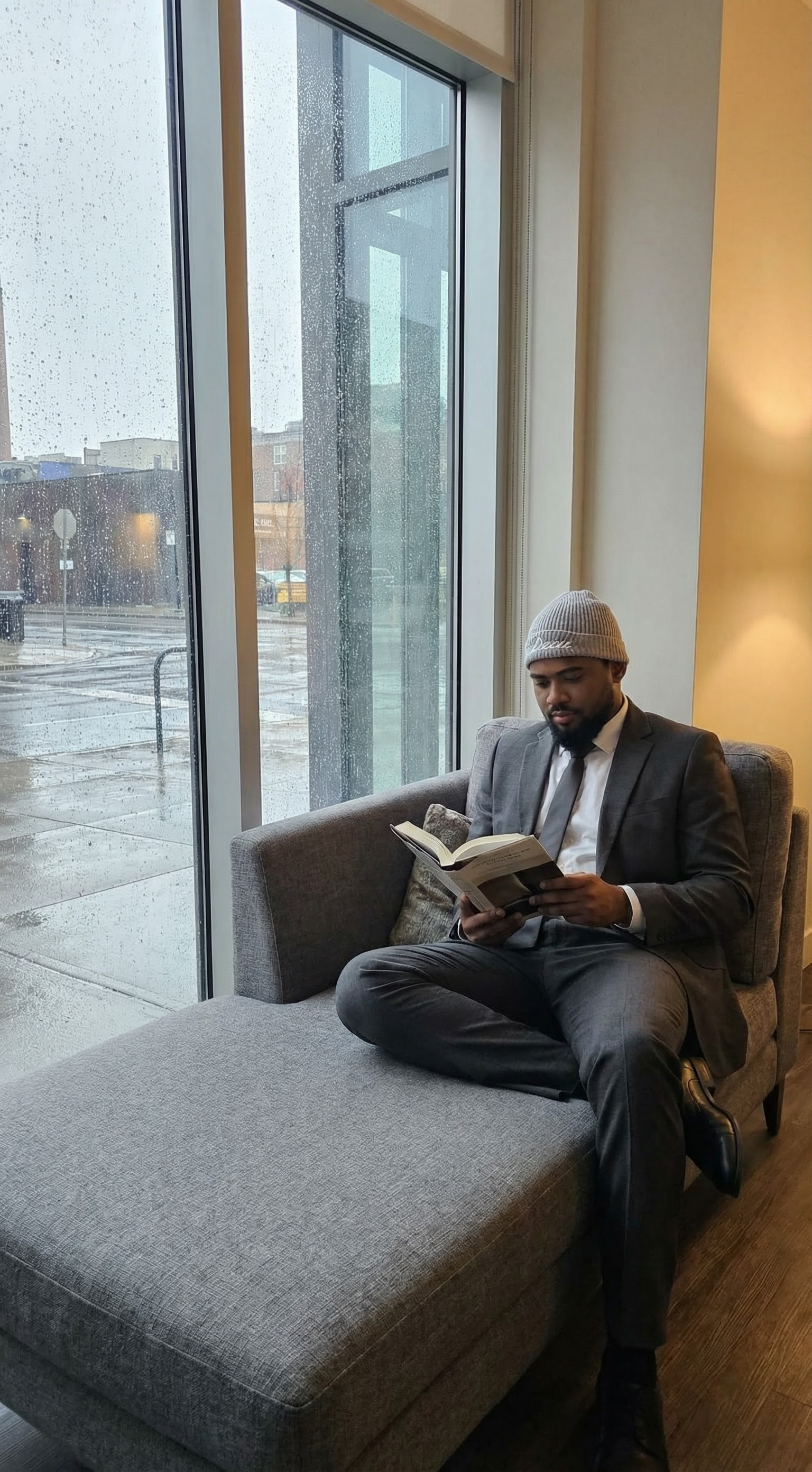 🎨 A man sitting on a modern curved “Dodine chaise lounge” near large floor-to-ceiling windows, reading a book while rain gently falls outside. Soft natural daylight mixed with warm indoor ambient lighting, raindrops visible on glass, cozy atmosphere, relaxed posture, detailed interior design, shallow depth of field, cinematic photography, ultra-realistic, 4k, soft shadows, moody tones.