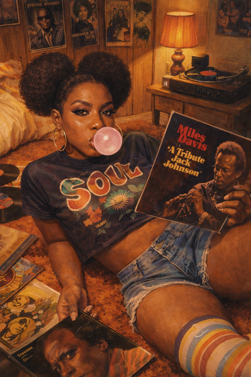 🎨 Use the attached photo as a strict facial reference only. Preserve exact facial features, freckles, skin tone, proportions, and likeness. Do NOT change identity. Do NOT beautify, reshape, or stylize the face away from realism. Create a semi-realistic retro illustration of an African American woman in a 1970s bedroom. Pose & Action She is lying comfortably on her bedroom floor, relaxed and expressive, holding a vinyl album cover from her favorite jazz artist. She is blowing a pink bubblegum bubble. Mood is carefree, nostalgic, and soulful. Hair Two large curly afro puffs Natural texture, volume, realism Wardrobe • Cropped vintage 1970s graphic T-shirt • Cut-off distressed denim shorts • Colorful knee-high socks • Large hoop earrings Makeup Authentic 1970s makeup Soft shimmer lids, defined lashes, warm tones, glossy lips Environment • Vinyl records and album covers scattered on the floor • Record player on a small table near the wall • Vintage posters covering the walls • Retro bedroom décor: warm wood tones, textiles, analog items, nostalgic details Art Direction • Feels like a classic 70s poster or album cover • Subtle film grain texture • Warm nostalgic lighting • Painterly semi-realistic illustration style • Editorial composition • Soulful, funky, culturally grounded energy Camera & Framing • Slight top-down or relaxed floor-level perspective • Lifestyle editorial framing • Emphasis on texture, mood, and era authenticity Overall Vibe Timeless 1970s record sleeve brought to life — feminine, playful, soulful, music-lover energy.