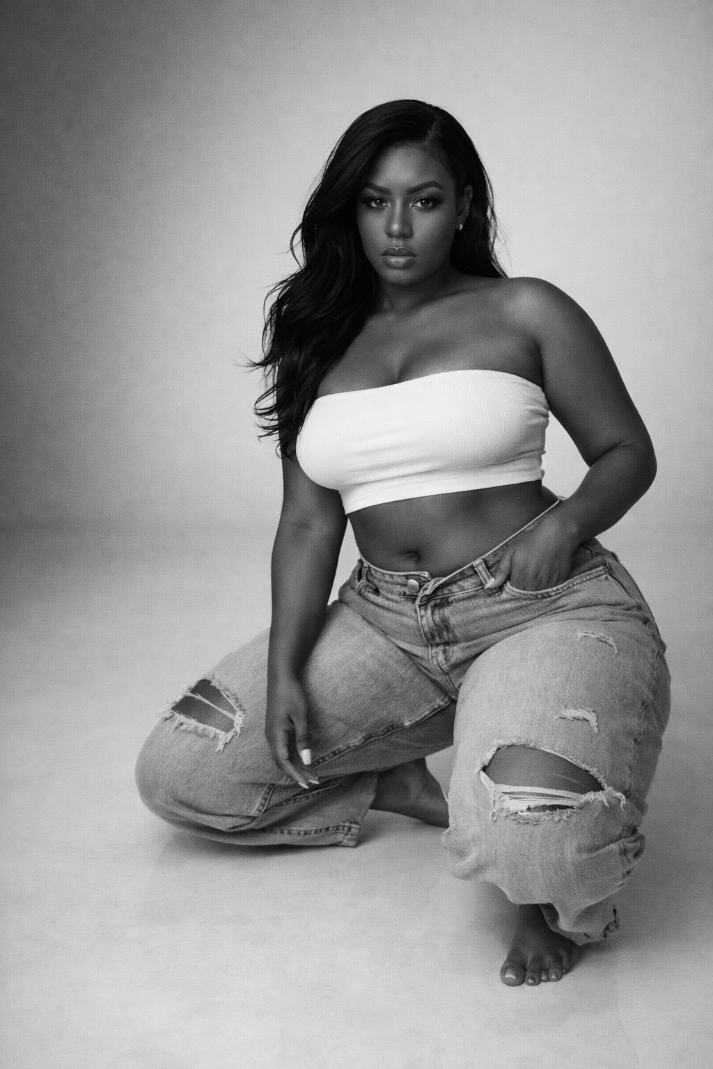 🎨 Photorealistic full-body studio portrait of a curvy woman with light caramel skin She has a naturally plush hourglass figure with real weight to her curves — full chest, small defined waist, full hips, and thick thighs. Her proportions are soft, feminine, and realistic. Her long black hair is styled in a deep side part with laid baby hairs and soft natural waves cascading over her shoulders. Long square nails. Outfit: fitted white ribbed bandeau crop top paired with low-rise, distressed light gray baggy jeans. The jeans are casually styled. She is barefoot. Pose: full-body seated pose in a relaxed contrapposto position, one hand hooked casually into the belt loops of her jeans. Body angled slightly to emphasize natural waist curve. Confident but effortless expression. Setting: seamless white cyclorama studio with a subtle shadow gradient behind her to create depth. Faint natural floor reflection beneath her. Lighting: soft but directional editorial studio lighting with gentle sculpting shadows along her waist and thighs. High-contrast black and white photography. Dramatic yet soft shadow definition. Style: minimal, intimate, high-fashion editorial aesthetic. Slight natural grain. Not overly sharp. Real skin texture with visible pores. No smoothing, no filters, no CGI, no illustration. Photographic realism. Camera: Canon R5. Soft editorial lighting. Unedited look.