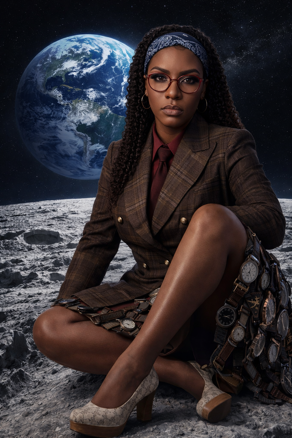 🎨 Identity locked to the reference image. Do not alter facial proportions. Ultra-cinematic 8K hyper-realistic portrait of the woman from the reference image seated on the surface of a massive full moon positioned at the bottom of the frame. The moon is extremely close to the viewer with hyper-detailed craters, textured lunar dust, natural rock formations, and deep realistic shadow pockets. Scientifically grounded realism. No fantasy glow. Behind her, the Earth is clearly visible in sharp, detailed focus — vivid blue oceans, swirling cloud systems, visible continents, natural atmospheric glow, accurate planetary scale. Not blurred. A faint Milky Way band stretches softly behind the Earth, subtle and astrophotography-realistic. Deep pitch-black cosmic sky with restrained star presence. High contrast, bold composition. Her face must match the reference image exactly — identical bone structure, almond-shaped eyes, nose shape, lips, dimples, natural skin texture, visible pores, warm light-brown complexion. No beautification filters. No facial reshaping. Expression: composed, neutral, controlled. Minimal smile. Steady gaze. Calm authority. She wears round red academic glasses with chain detail. A faint, realistic reflection of the Earth appears in the lenses. Long, voluminous, tightly curled natural hair with realistic definition. Structured brown double-breasted plaid blazer, deep red tie, sculptural skirt made of layered vintage watch straps and belts. Watch faces display subtly different times, realistic clock detail. Beige monogram platform heels with wooden heels. She sits with one knee raised, posture upright and centered. Cool silver moonlight rim lighting. Natural cinematic key light on her face with realistic shadow depth. All elements sharp and detailed — moon, Earth, Milky Way, subject. Museum-level fine art realism. Medium-format clarity. No fantasy exaggeration.