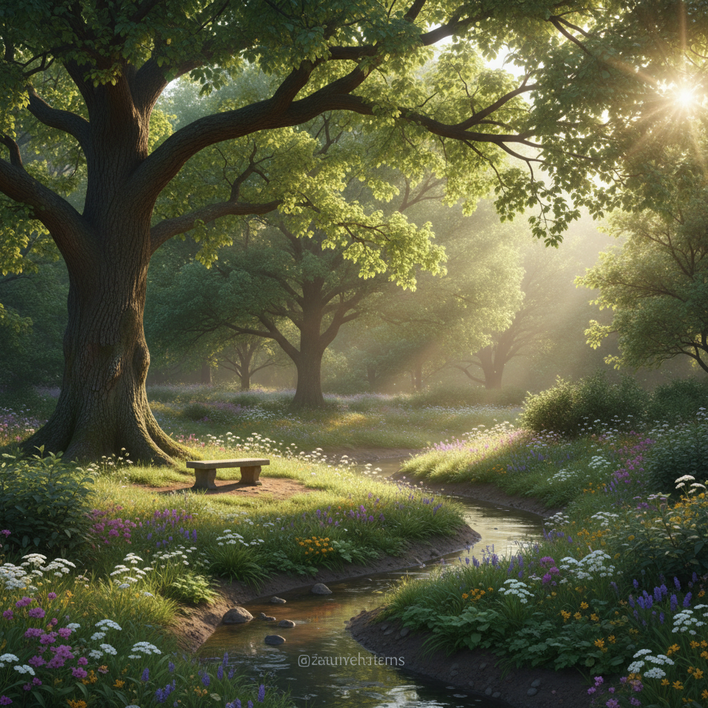 Un havre de paix, riches en arbre majestueux et aux feuillages verdoyant couvert de rosée, offrant une ombre fraîche et apaisante. Un lieu paré de fleurs parfumées où le chant doux des oiseaux accompagné le murmure d'un ruisseau, dégageant une énergie positive en ce beau matin.