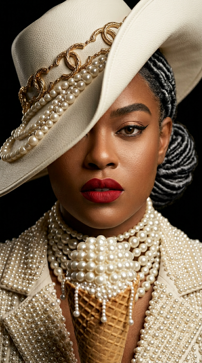 realistic high-fashion image of an elegant African american woman with light caramel skin, wearing a textured ivory wide-brim hat adorned with CC -for coco chanel gold initials and strands of pearls that cascade down the brim; straight hair is blonde in a bun in the back, one eye partly obscured by the hat, the visible eyelid shimmering bronze with precise winged eyeliner, full matte deep red lips slightly parted. She wears multiple layers of lustrous pearl necklaces that wrap around her neck like a sculptural collar. Matching strings of pearls blazer. In the foreground she holds a waffle cone topped with a melting scoop made entirely of perfectly round pearls dripping pearl strands over the cone. Rich contrast, studio black background, dramatic soft cinematic rim and key lighting highlighting fine textures: leather grain of hat, woven waffle pattern, iridescent pearl surfaces, skin pores and matte lipstick. Ultra-detailed, photoreal, 85mm portrait lens feel, shallow depth of field, 8k, flawless retouching, elegant couture styling, subdued color palette of ivory, gold and crimson, immaculate composition, symmetrical, luxurious, surreal yet tasteful. SLIM physique, facial features exactlty as shown in photo provided. No Ai image or Facial altering, leave the hair like that and make my face appear clearly