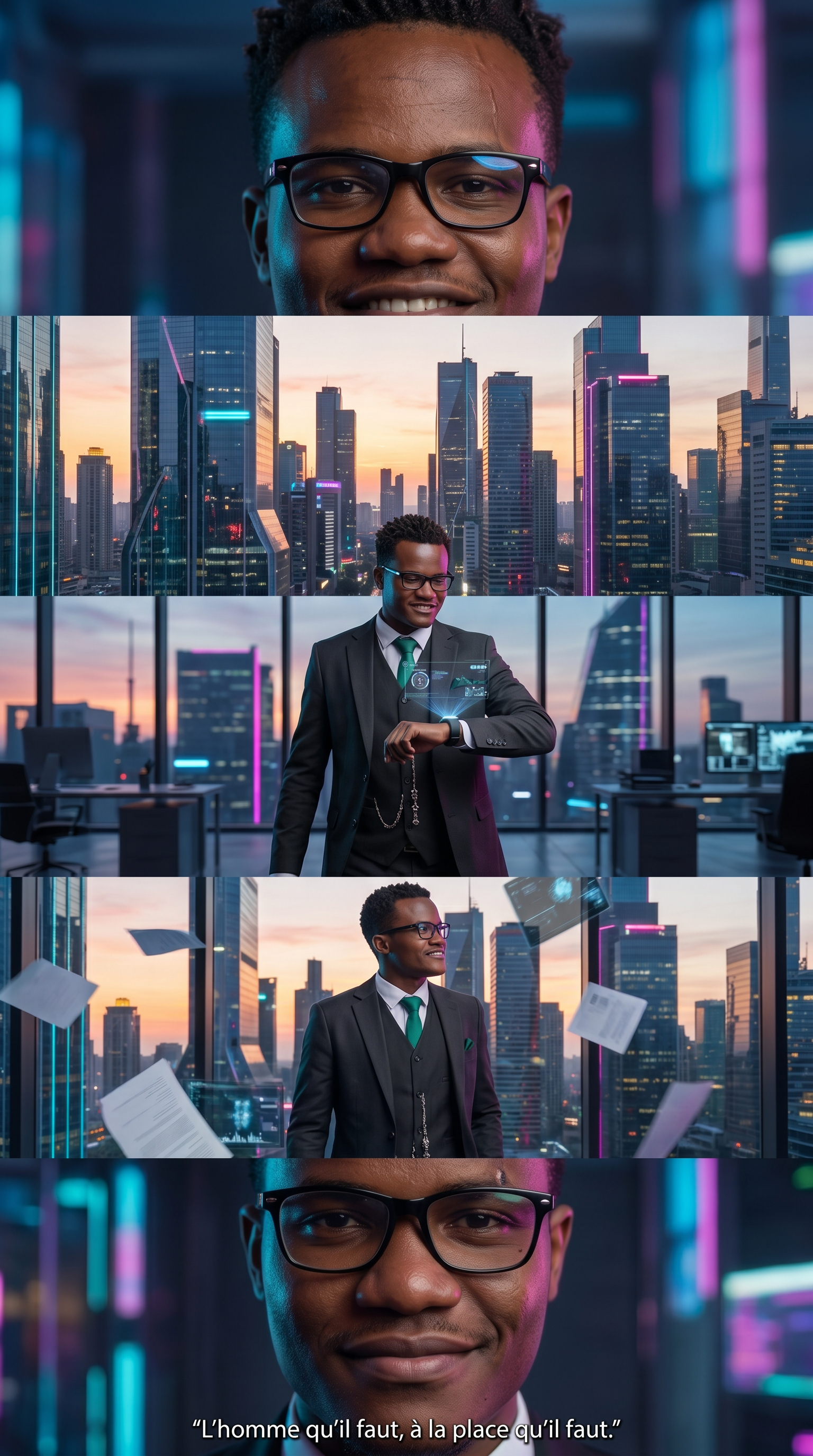 The closing frame is a tight zoom onto Rotniel’s face as he turns toward the horizon, expression unreadable yet resolute. His voiceover softly intones, “L’homme qu’il faut, à la place qu’il faut,” just before the screen fades to black with the quiet buzz of neon lights.