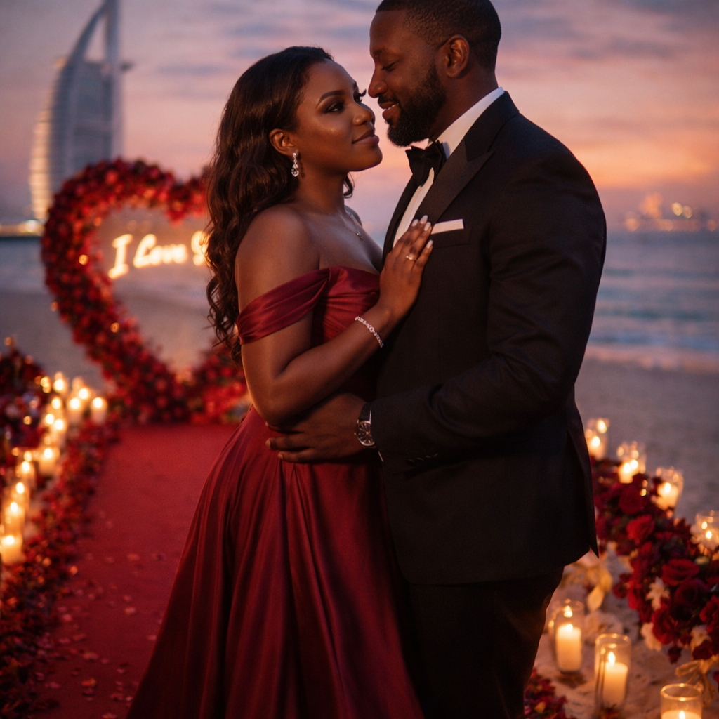 A cinematic Valentine’s evening moment captured at golden hour transitioning into twilight.