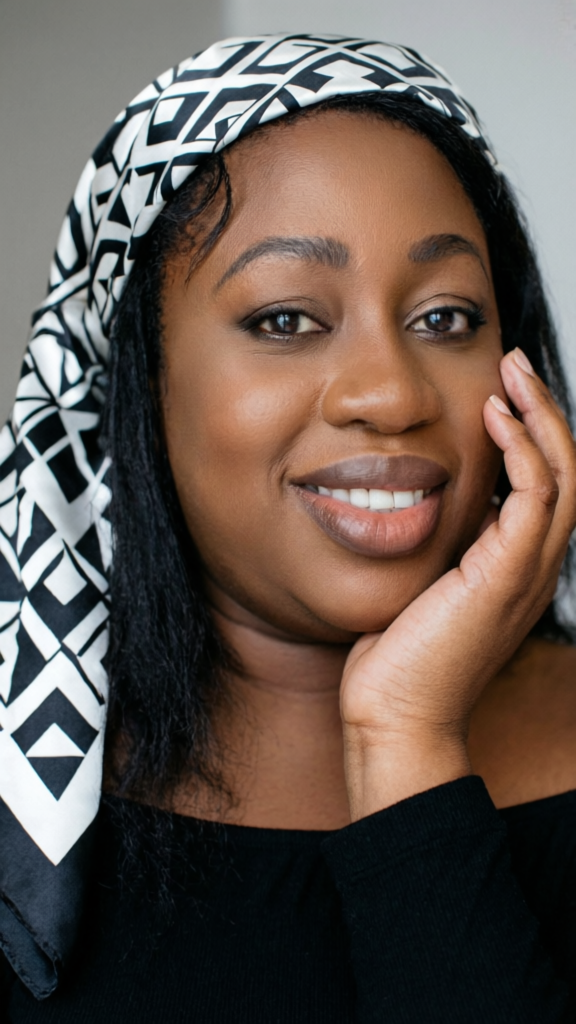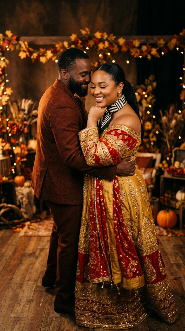 In a cinematic autumn studio setting, a brown-skinned plus-size woman dances tenderly with her partner, exuding romance and elegance. She dons a luxurious traditional ensemble in bold gold and radiant red tones, inspired by high-end designers like Dolce & Gabbana or Gucci, with an off-shoulder neckline that beautifully reveals her skin. Her iconic black and white geometric foulard is perfectly styled, paired with a clean, pulled-back ponytail revealing her peaceful, smiling face. Her makeup is minimal yet highlights her captivating eyes, maintaining recognizable features and consistent accessories. She strikes a spontaneous pose with her hand gently supporting her chin, adding an authentic and intimate feel. The cinematic autumn lighting bathes the scene in warm, golden amber tones, castintic shadows that deepen the romantic ambiance.In a cinematic autumn studio setting, a brown-skinned plus-size woman dances tenderly with her partner, exuding romance and elegance. She dons a luxurious traditional ensemble in bold gold and radiant red tones, inspired by high-end designers like Dolce & Gabbana or Gucci, with an off-shoulder neckline that beautifully reveals her skin. Her iconic black and white geometric foulard is perfectly styled, paired with a clean, pulled-back ponytail revealing her peaceful, smiling face. Her makeup is minimal yet highlights her captivating eyes, maintaining recognizable features and consistent accessories. She strikes a spontaneous pose with her hand gently supporting her chin, adding an authentic and intimate feel. The cinematic autumn lighting bathes the scene in warm, golden amber tones, castintic shadows that deepen the romantic ambiance.1