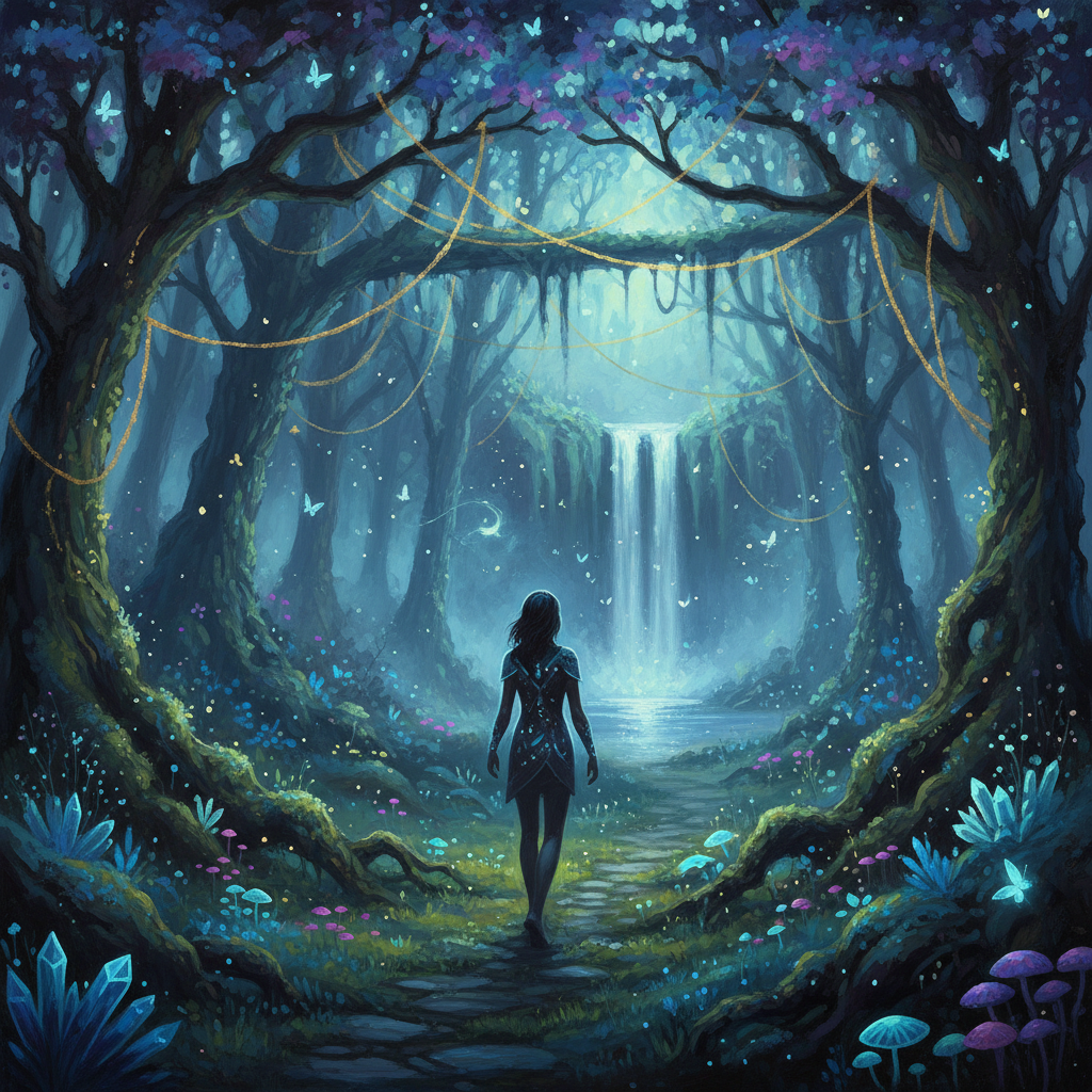 A person walking through a glowing forest at dusk, magical realismA person walking through a glowing forest at dusk, magical realism