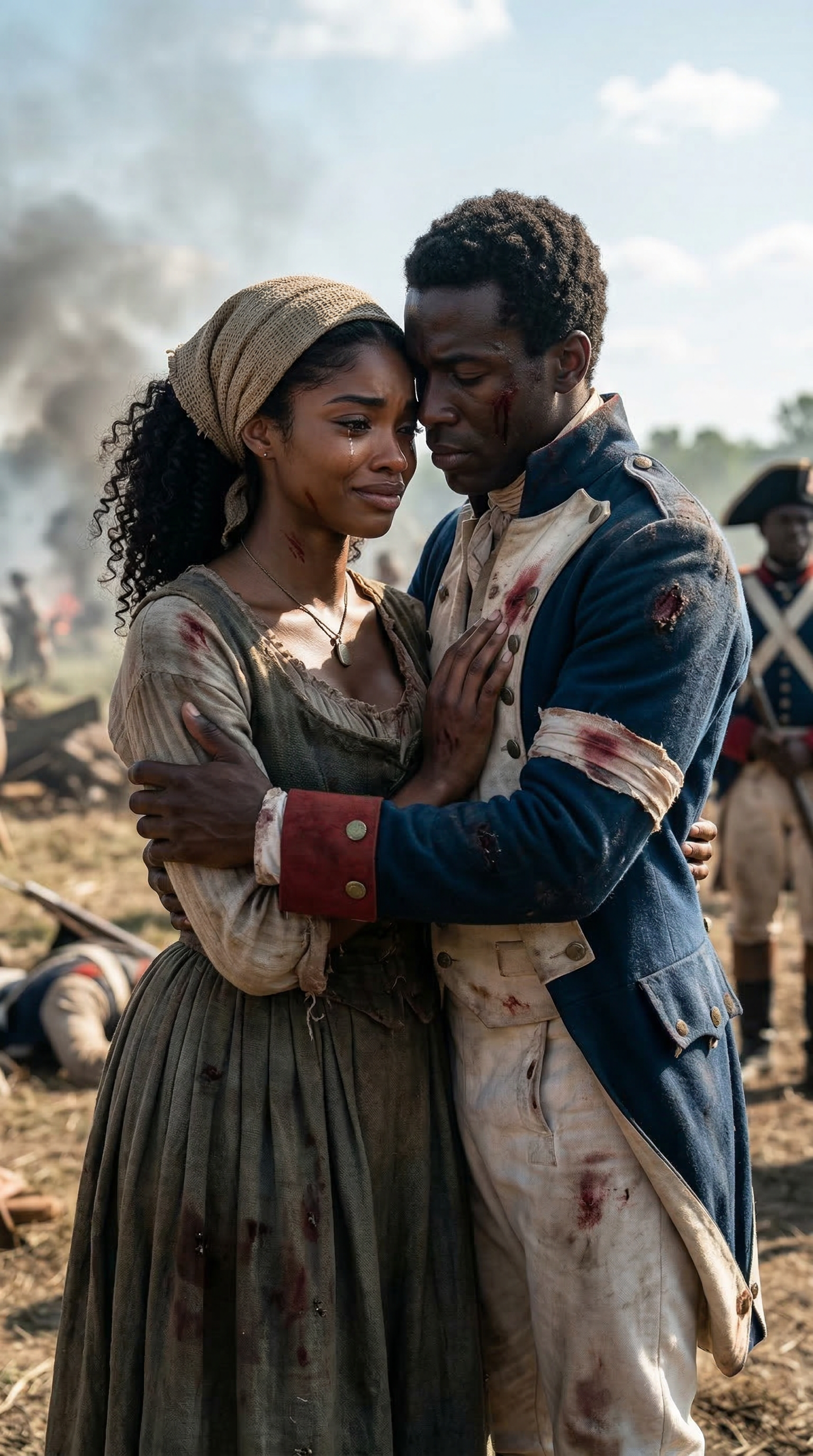 1. A photorealistic scene capturing a romantic couple standing close together on a sunny day under a clear sky, their faces tender and affectionate as they share a final moment. The woman, dressed in historically accurate 1804 Haitian Revolution-era clothing—worn, rugged fabrics with subtle bloodstains—keeps her recognizable features and consistent accessories such as a simple woven headscarf and a small pendant necklace. The man wears a similarly weathered military uniform from the period, visibly wounded but holding her gently. The lighting is cinematic and moody, casting soft shadows that deepen the emotional intensity, emphasizing their loving expressions amid the turmoil of war.1. A photorealistic scene capturing a romantic couple standing close together on a sunny day under a clear sky, their faces tender and affectionate as they share a final moment. The woman, dressed in historically accurate 1804 Haitian Revolution-era clothing—worn, rugged fabrics with subtle bloodstains—keeps her recognizable features and consistent accessories such as a simple woven headscarf and a small pendant necklace. The man wears a similarly weathered military uniform from the period, visibly wounded but holding her gently. The lighting is cinematic and moody, casting soft shadows that deepen the emotional intensity, emphasizing their loving expressions amid the turmoil of war.19